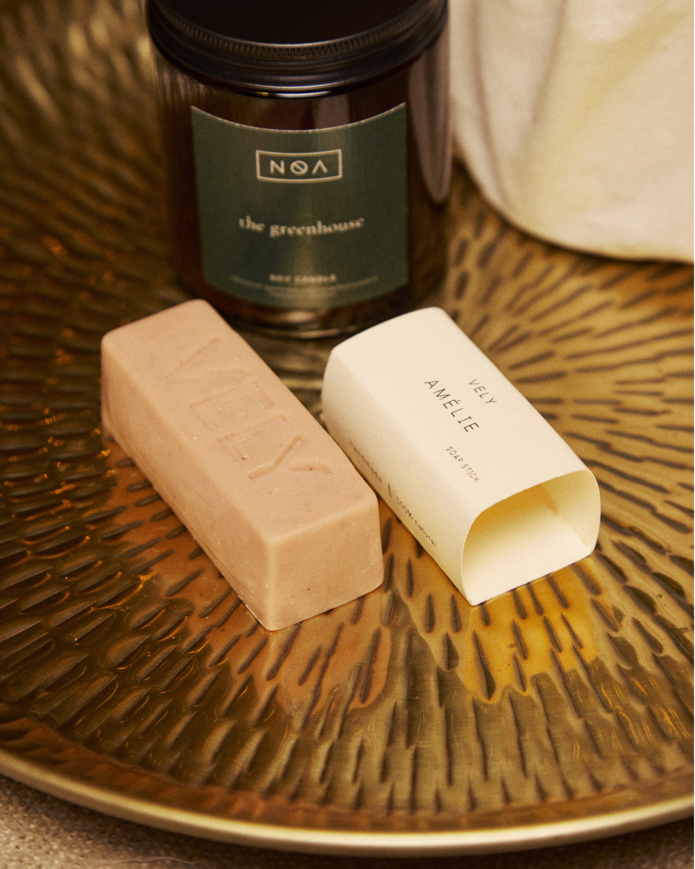 VELY Amélie Soap Stick: A blend of rosemary, ylang-ylang, and lavender essential oils with soft pastel pink clay and finely ground almond shells for gentle exfoliation. A delightful, everyday pampering bar, handmade with care for a truly luxurious feel.